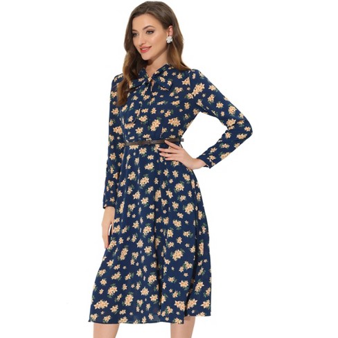 Allegra K Women S Floral Print Bow Tie Neck Long Sleeve Belted Casual Flowy Midi Dress Target